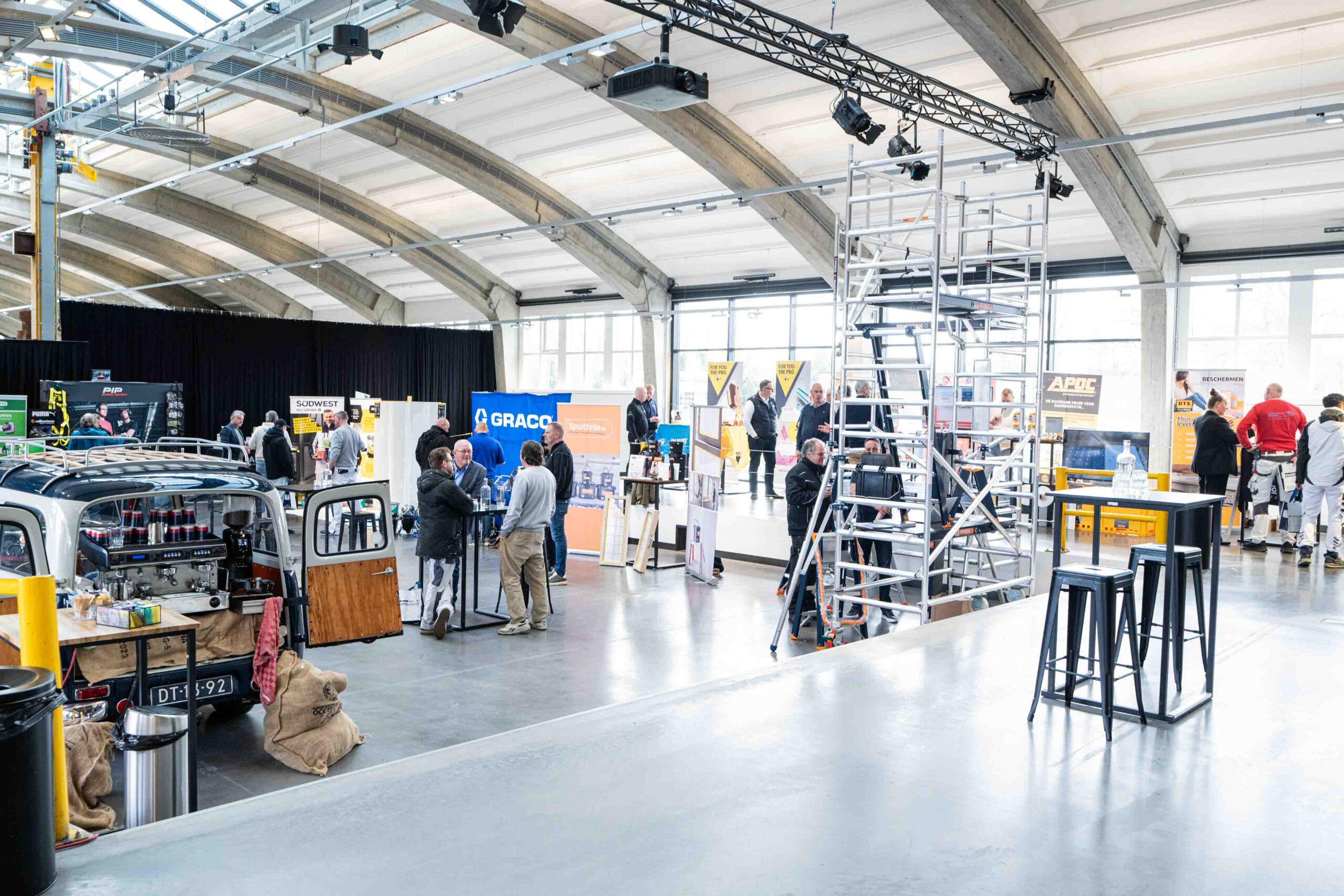 Voor dit event was onze grootste evenementenruimte, De Smeltkroes, het decor. De rauwe, industriële uitstraling van de fabriek vormt het perfecte contrast met de strakke stands en glimmende materialen van de exposanten. Met hoge plafonds en een robuuste betonvloer biedt deze ruimte de nodige ‘body’ voor een evenement waar ook groter materieel, zoals rolsteigers, een plek moet krijgen.
