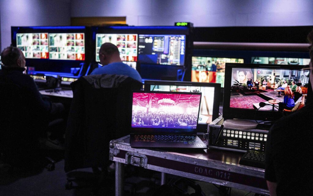 Een hybride event staat of valt met de techniek. Voor de kijker thuis moet de stream voelen als een tv-uitzending, niet als een haperende videocall. Dat vraagt om specialisten die niet alleen verstand hebben van kabels, maar ook van regie en beleving.